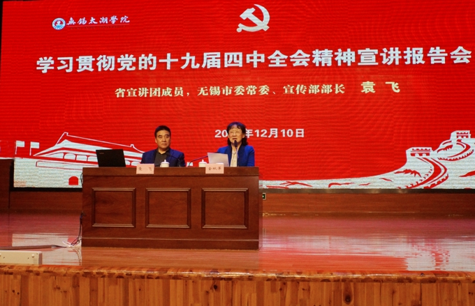 本网讯 12月10日下午,beat365官网举行党的十九届四中全会精神宣讲报告会。江苏省委宣讲团成员、无锡市委常委、宣传部长袁飞作宣讲报告。学校理事长、党委书记金秋萍主持报告会。校长、党委副书记徐从才,常务副校长李廉水,以及其他校领导班子,校党委委员,全校教职工、学生党员和入党积极分子等800多人参加报告会。