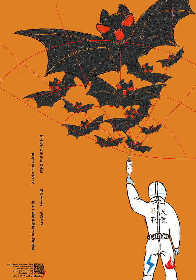 设计说明:作品主分为黑与白两个色调,寓意工作在一线的医生们不分昼夜的去抗击此次疫情,而这次病毒是由蝙蝠引起,所以画面的右边是一个蝙蝠形象的恶魔,也从侧面衬托出医生们的英雄气概。是他们一直在守护我们的城市,是他们一直在于病毒做抗争,我们要向这群可爱之人致敬。