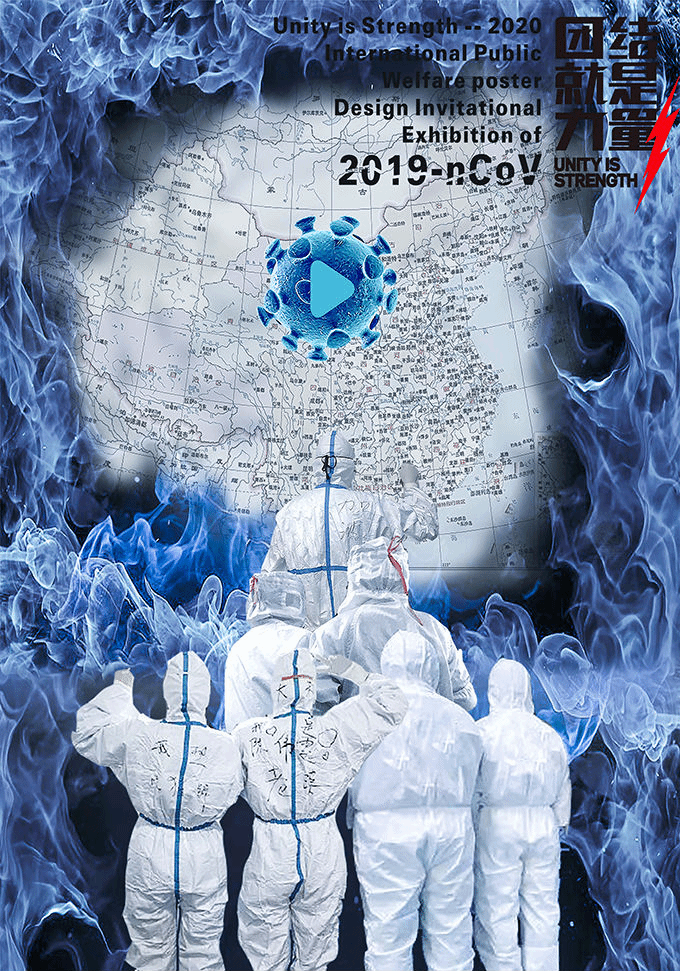 设计说明:新型冠状病毒在全国范围扩散传播,出于对人们的保护,全国开始封锁战略,所有人都只能待在家里,全国仿佛被新型冠状病毒按下了暂停键,商场关闭,马路无人,一片萧条。但在这时医护人员就是逆行者,在拼尽全力救治病人,无惧危险。医护人员如同战士,奋力的想重启人们的正常生活。设计海报正是反应了现状,以病毒形状的暂停键为中心,寓意全国被暂停的萧条状态,而穿着各式各样防护服的医护人员们在危险的疫情中,团结一心,奋勇向前,即将按下暂停键,重启大家的生活,也寓意着疫情会在全国人名以及医护人员团结一心得到努力下得到控制并消灭,大家又可以回归正常的的生活。