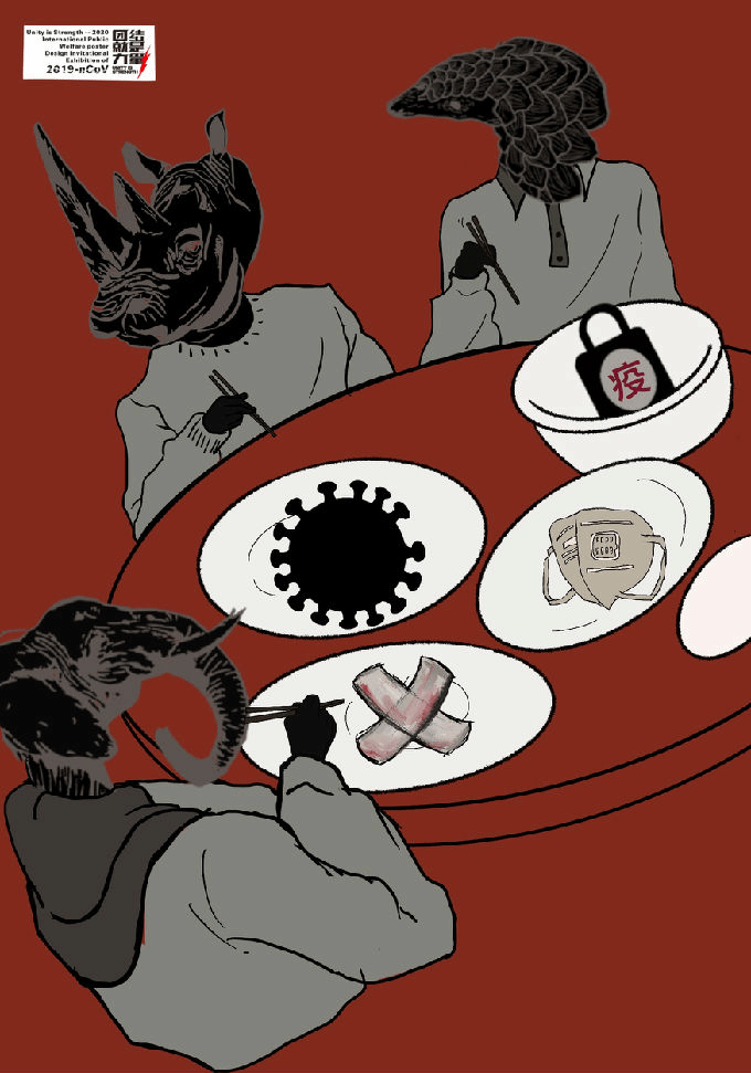 设计说明:这个想法是将坐在餐桌上享受“美食”的人们换成了受伤的动物们,餐盘里放着人们如今承受的痛苦与煎熬,另一方面也引导疫情防范。若想悲剧不再重演,必须做到人与自然和谐共处、保护大自然、尊重大自然,促进社会和谐发展。