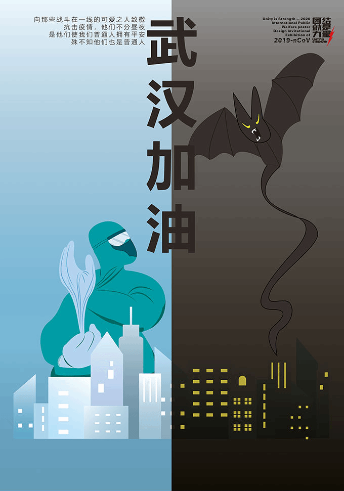 设计说明:双手合十是人们齐心协力帮助武汉为武汉加油的象征,手掌下方的被捏掉的蝙蝠表明了这次疫情的起因也表明了大家决心戒掉乱吃野味的决心。手掌上方是英文字母”alive“像针一样刺进手里表明医护人员为了拯救患者付出的努力和代价。