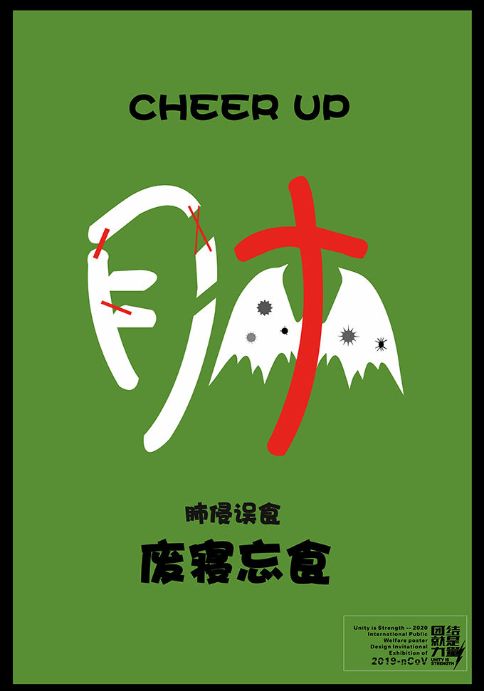 设计说明:因此次疫情是新冠肺炎,由少部分人误食蝙蝠,祸从口入导致形成的全国性疫情,所以图中由蝙蝠,医院十字架,和新冠肺炎病毒组成的“肺”字;月字旁分裂表现出疫情导致很多家庭在过年期间家人奋斗在一线不能团聚和因疫情去世不能相守的含义,直观表达了此次疫情的起因。另外图中的文字部分“肺侵误食”由下边“废寝忘食”谐音演变而来。“肺侵误食”是说人们误食了东西,导致肺部受到病毒侵占;“废寝忘食”表达的是奋斗在一线的人们只顾得工作忘记吃饭的意思。