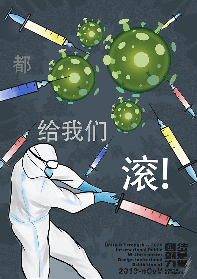 设计说明:海报的主色调为蓝色,主要设计内容是,抗疫一线的医生们用疫苗、抗生素、针筒这些抗疫手段,用打击棒球的动作将疫苗打出去,体现各位医护人员努力奋战在一线的场景,不同颜色的针筒,代表不同地区不同身份的人民,用不同的方式,对抗同一个敌人。