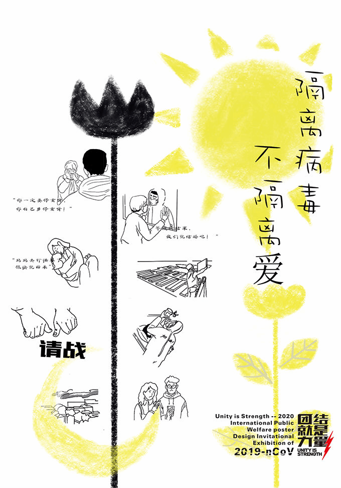 设计说明:新型冠状病毒来势汹汹,为切断一切可能的传播途径,需要对重点群体采取隔离措施。但是身相远,心相近,隔离病毒但不能隔离爱,我看见劝返去亲戚家的群众,雨夜中的坚守,志愿者为值班干警送去食物等,疫情碰上爱情,隔断了浪漫,却割不断真情。等疫情结束,春天到来,摘下口罩,我们好好拥抱。