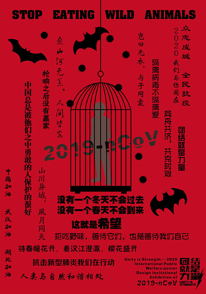 设计说明:因为疫情,全国各地的人们都在家不能出门,仿佛在一个笼子之中,而其他生物可以在外面自由的活动,像是一场毁灭世界的活动似的,人类和动物反过来了。版式用了很多醒目抗击疫情的标语或者口号,或大或小,增强人们对打败病毒,早日恢复出行的信心,也是提醒着人类要和自然和谐相处。非典的惨痛教训并没有使中国人长记性,这次又复发了,人们虽然众志成城团结一致,但实际上人类在自然面前显得弱小无助,希望人们记住要和自然和谐相处,一定不能打破这种平衡。