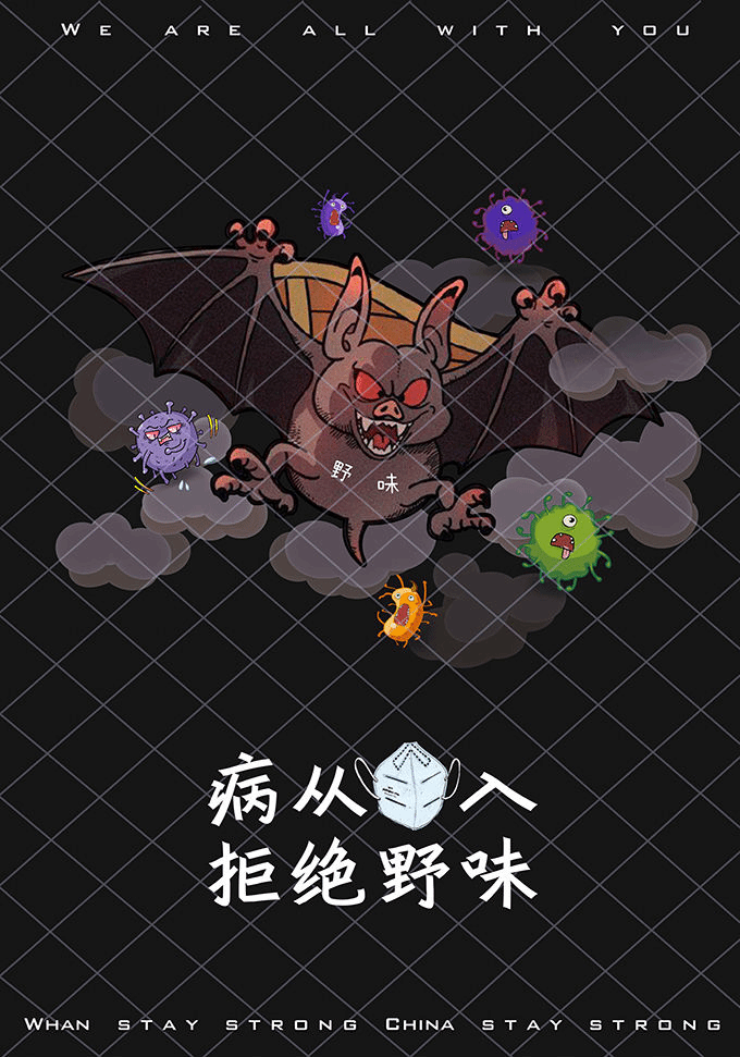 设计说明:病从口入,拒绝野味。大自然带给我们的是可爱的野生动物,是需要我们人类保护的;我们要敬畏自然,保护自然,不食野味,我们应该严于律己,吸取教训。