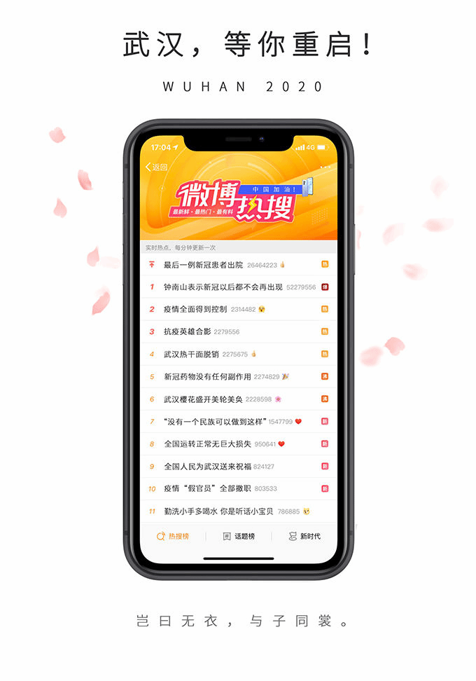 设计说明:春节以来,全国人民的“宅生活”,天天在家刷着微博,看着揪心的前线消息。每一个人期待着喜报频传,微博热搜好消息喷涌的场景。