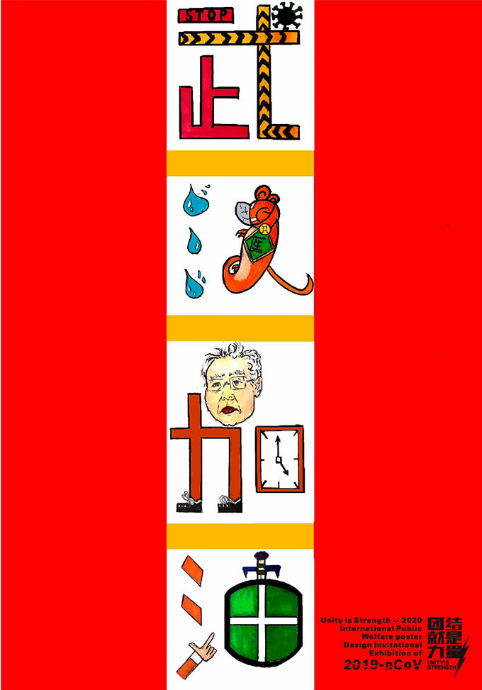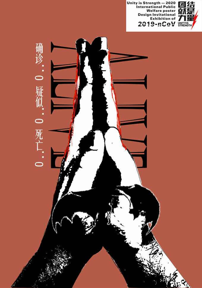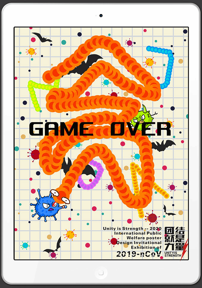 设计说明:作品灵感来源于贪吃蛇游戏,通过平板界面的方式传达拒绝野味主题。最大的蛇为“贪”字,伴随着“贪”越来越大,危险(死亡)也随时爆发,来警示我们不要什么都吃。其余为“N”“C”“O”“V”(新冠肺炎缩写)。现如今,新型冠状病毒来势汹汹,而引发这次病毒事件的源头是吃野味。用游戏结束来警惕人们,提高防范意识。抗击疫情,我们一起前行!