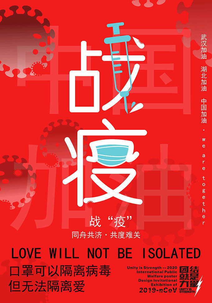设计说明:战“疫”,音同战役,象征着此次疫情就像一场战争,也寓意着“战胜疫情”。用医用注射器与战字结合,表达了此次疫情需要相信前线的医护人员,他们是我们战胜疫情的最大希望。疫字与口罩结合,代表了科学防护是对自己、对他人的最大帮助。背景用红色,代表了人民众志成城的心,病毒在蔓延但我们只要团结一心,就能迎来胜利。