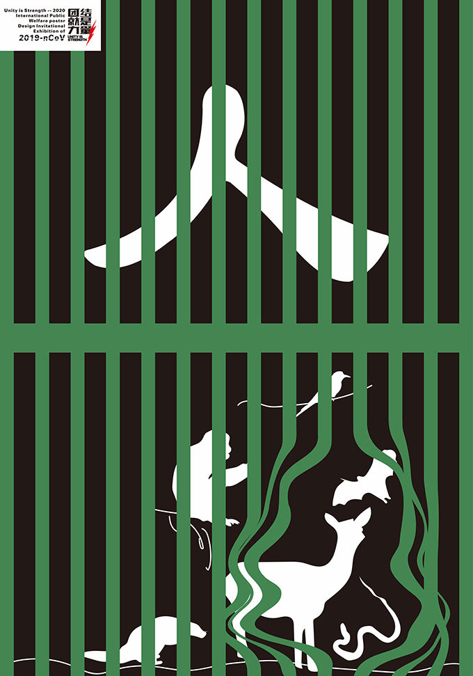 设计说明:疫情没爆发之前,人们把野生动物关在笼子里,在野生动物市场进行私下售卖,疫情爆发后,由于野生动物身上存在大量病毒,也存在人传人的现象,全中国人民只能避免外出,待在家里,减少病毒的传播,就像是之前把野生动物关在笼子里一样,如今人在笼子里,动物却打开牢笼,回到大自然,如此明显的角色反转,告诫人们不要贪吃野味,放生野生动物是最好的选择。