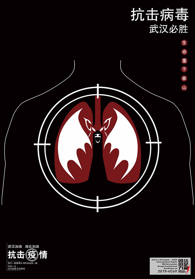 设计说明:海报大部分颜色采用黑色、白色和红色三种颜色,醒目又显眼,中间有人体形状的线条轮廓,描绘出人体的形象,并且运用肺的形状和蝙蝠的形状具有的相似性结合起来,提醒大众拒绝吃野味,病从口出。海报中有狙击病毒的瞄准图样,更加明显的表现出抗击疫情的主题。