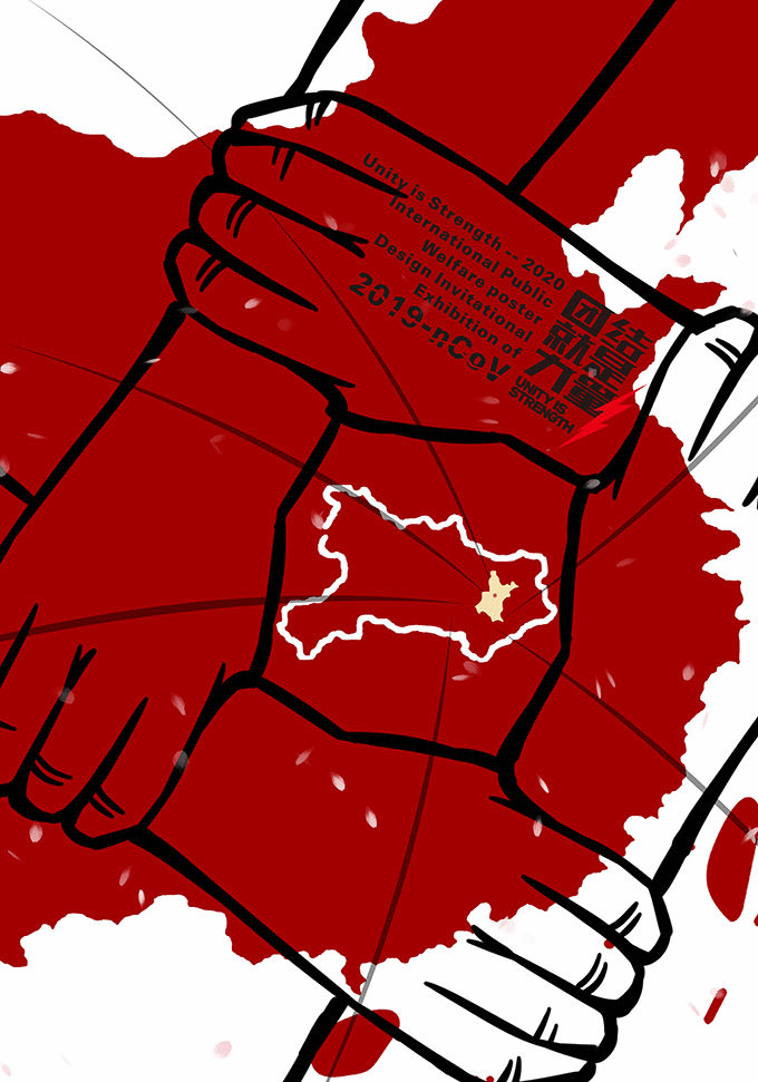 设计说明:全篇采用红黑白三色,强调突出;四只手相交而握,包围着湖北省,四散的箭头表示,五湖四海,全国全球人民都关注着武汉、关怀着湖北、关心着中国。没有被禁锢的城,只有离不开的爱,些许樱花,愿春暖花开之时,一切病痛远离,武汉加油!中国加油!