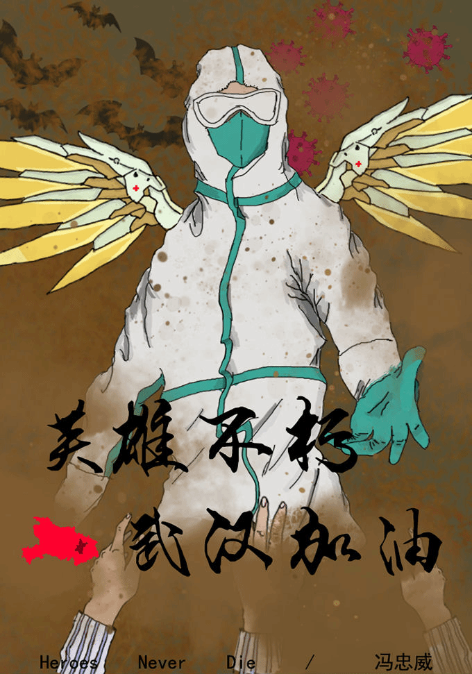 设计说明:海报的主角是一名医护人员,背景是棕色的烟雾,烟雾代表着此次疫情的危险,医护人员穿过层层烟雾,经历种种艰难险阻,不惜一切来到人名群众、患者的身边,像天使下凡一样,普度众生,给予人民群众最有利的帮助,帮助人民群众们树立信心。向白衣天使致敬,英雄不朽!Heroes Never Die!