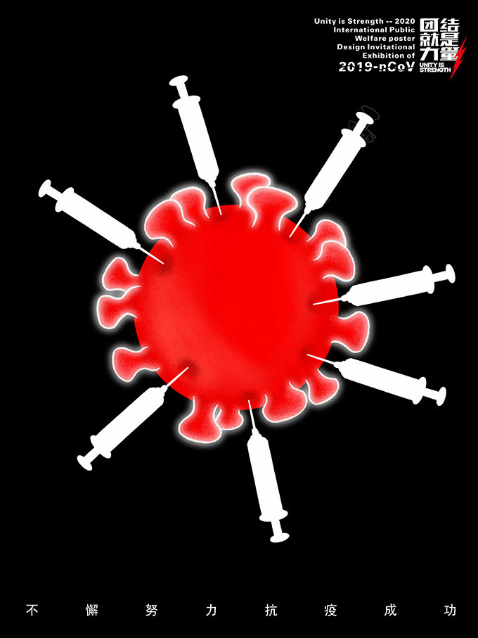 设计说明:用红色表示危险,用红色来画这个病毒象征着我们正受这个病毒的迫害,然后用了解决我们平时生病用的针筒,寓意着希望病毒能被医护人员快点消灭,大家早日康复。