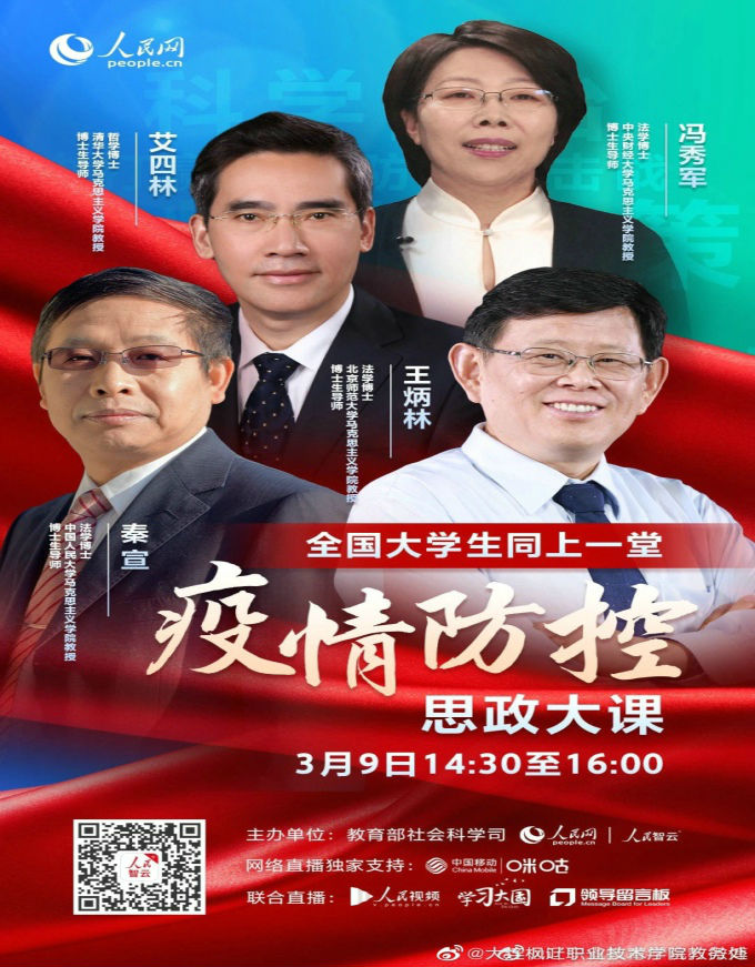 据悉,本次“思政大课”特别邀请艾四林、秦宣、王炳林、冯秀军四位教授,结合《马克思主义基本原理概论》《毛泽东思想和中国特色社会主义理论体系概论》《中国近现代史纲要》《思想道德修养与法律基础》四门必修课教学内容,解读党中央关于疫情防控的决策部署,分析中国抗疫彰显的中国共产党领导和中国特色社会主义制度的显著优势,讲述防疫抗疫一线的感人故事。