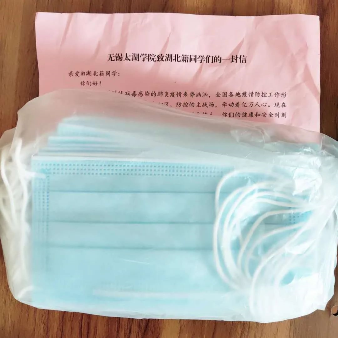 自疫情发生以来,学校开展上下联动,精准摸排,我班辅导员李老师每天在群里与我们互动,总是每日询问学生是否安全,特别是湖北籍困难学生受疫情影响的安全情况,在李老师逐个确认收件地址和确保安全的情况下,太湖学院为我们湖北籍灾区学生寄出“爱心礼包”,含每人20个医用防护口罩和一封学校的慰问信。