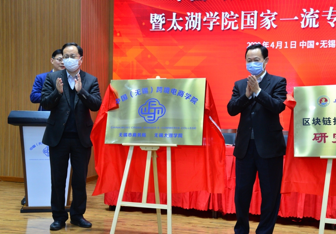 本网讯 4月1日,中国(无锡)跨境电商学院在beat365在线唯一官网揭牌成立。市政协主席周敏炜为跨境电商学院、3个国家一流专业和“区块链技术研发和应用中心”揭牌。市教育局局长唐加俊、市商务局局长汪行、市商务局跨境电商处处长欧国君、滨湖区商务局副局长印德强等出席本次活动。中国服务贸易协会副会长、秘书长仲泽宇,中国电子商务跨境电商工作委员会秘书长吴申星,无锡跨境网商商会会长许大可、秘书长葛加平,江苏省跨境网商商会联盟创始人刘学绪,无锡跨境电商中小企业商会会长宋花江等行业协会代表,以及中国邮政集团有限公司无锡市分公司副总经理黄定清、eBay大中华区商务总监刘德强、无锡光柏网络科技有限公司总经理汤叶灿、无锡光柏网络科技有限公司联合总经理朱振伟、阿里巴巴通锡区总经理张志飞、无锡优级先科信息技术有限公司总经理孙钰、无锡壹佳环球科技有限公司总经理胡诸鸿等企业代表参加。学校理事长、党委书记金秋萍,副校长陈鹏飞,学校中层以上干部、商学院部分教师代表参加。会议由副校长陈鹏飞主持。