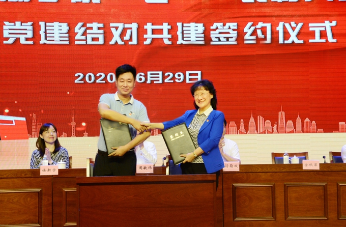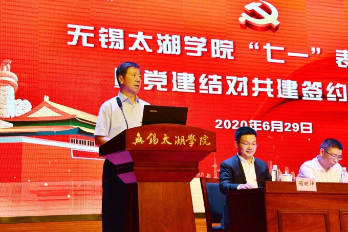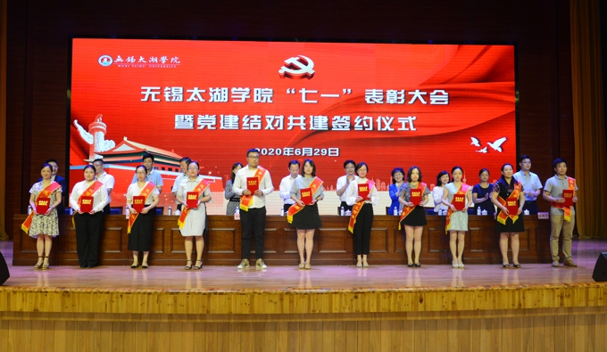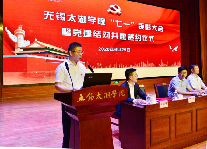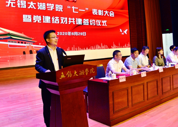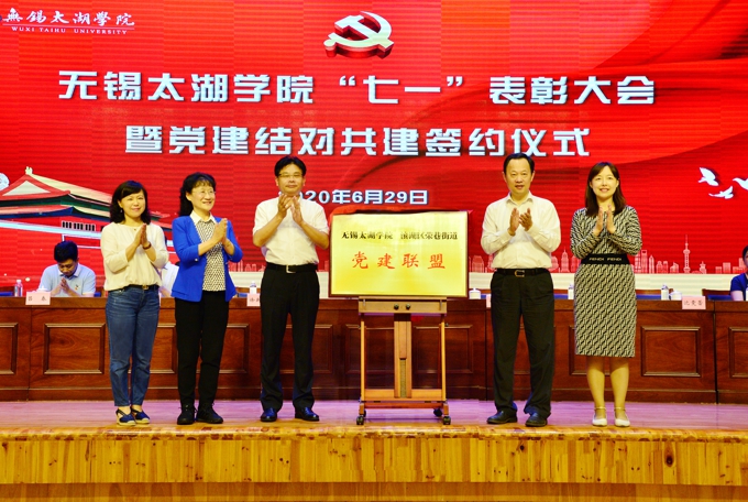 6月29日下午,beat365在线唯一官网举行“七一”表彰大会暨党建结对共建签约仪式。无锡市政协主席周敏炜出席并讲话。市委教育工委副书记符菊成、滨湖区副区长徐新宇,滨湖区荣巷街道新峰社区党委书记吕春、党委副书记王霞出席会议。学校党委书记金秋萍、校长李廉水,校领导丁涛、陈鹏飞、阙明坤,全体党委委员、全校教职工、毕业生党员代表参加会议。会议由校长助理、党委委员阙明坤主持。