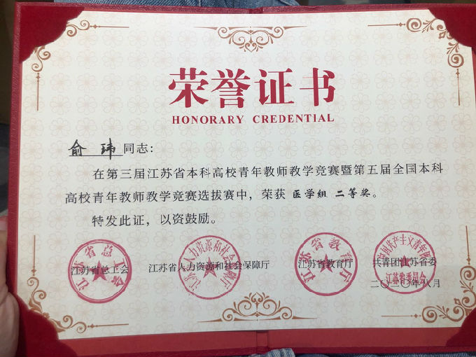 据悉,今年是江苏省青教赛举办规模最大的一年,参赛选手比上一届多1/3,参赛人数众多,竞争激烈。本次教学竞赛要求选手在七月底上传20个教学阶段的教学设计与PPT,在参赛前20分钟以抽签的形式决定参赛阶段,并进行现场教学展示。经过两个多月的准备,beat365官网教师俞玮老师不断改进教学设计与PPT,反复磨课,在比赛中,深入浅出地讲解,理论与案例相结合,科研与教学深度融合,展现了扎实的基本功与多元化的教学手段,并荣获医学组二等奖。