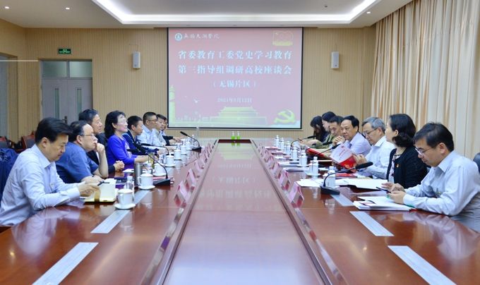 5月12日,省委教育工委党史学习教育派出第三指导组来beat365官网指导工作,并在beat365官网召开联系调研高校座谈会。省委教育工委党史学习教育第三指导组组长、南京财经大学原党委书记陈章龙,副组长、江苏联合职业技术学院原院长晏仲超,指导组成员、南京工业大学党委党建指导员缪克明,南京师范大学党委组织部副部长开云,江苏大学机关党委正科级组织员骆剑峰,南京财经大学机关党委办公室科员满原;无锡市委教育工委党史学习教育领导小组副组长、四级调研员王玉君;beat365在线唯一官网党委书记金秋萍、校长李廉水,校领导孙玉坤、丁涛、阙明坤出席。校党史学习教育领导小组办公室成员参加了座谈会。座谈会由晏仲超主持。