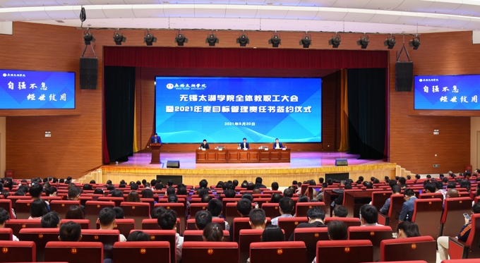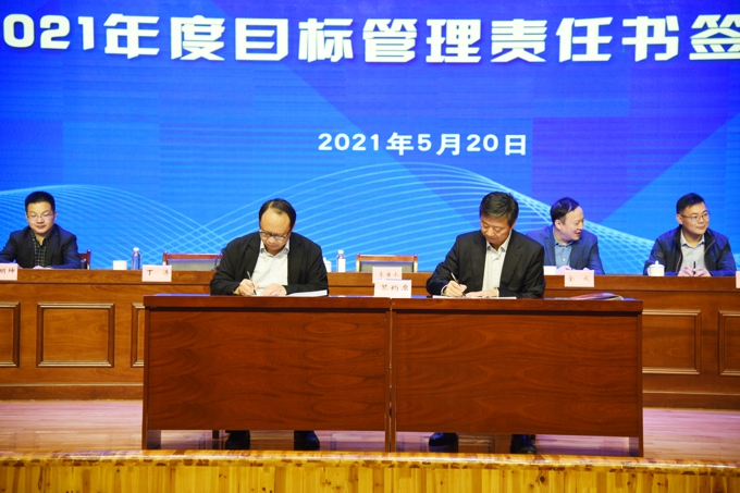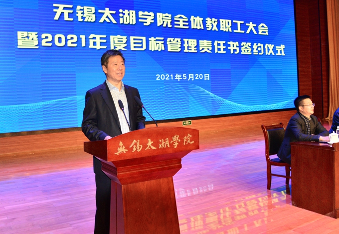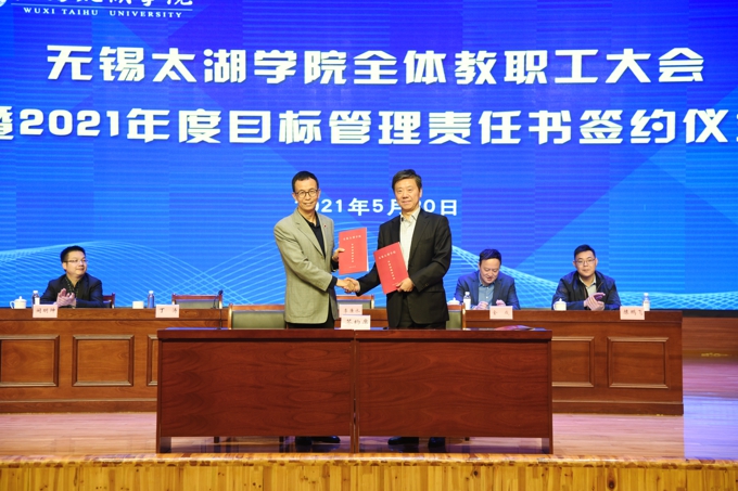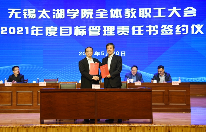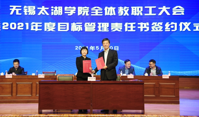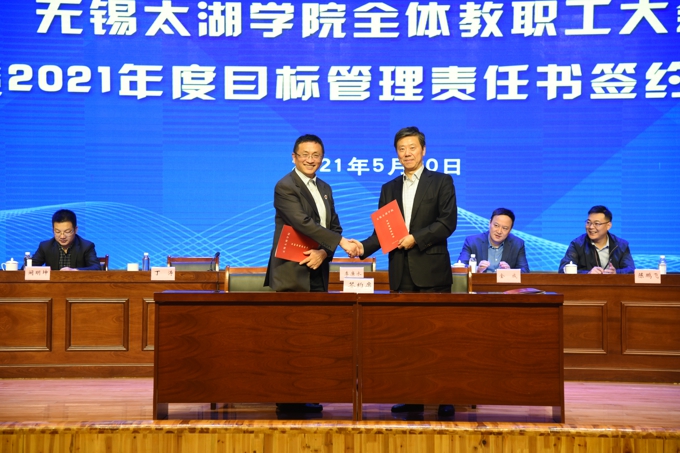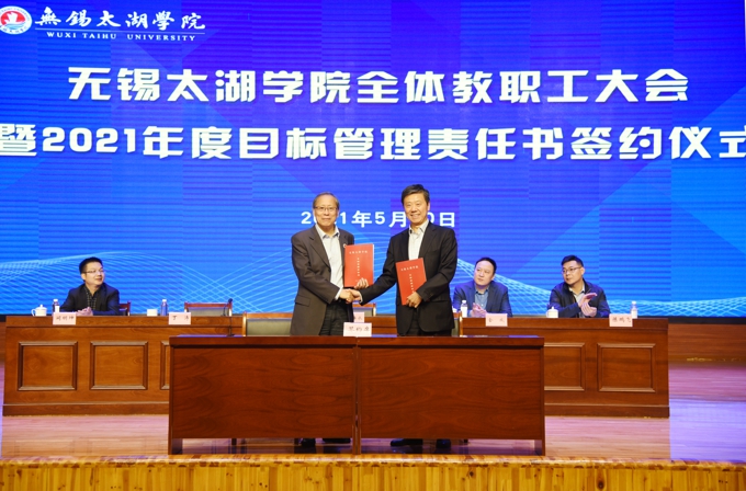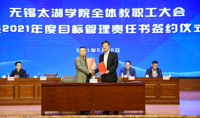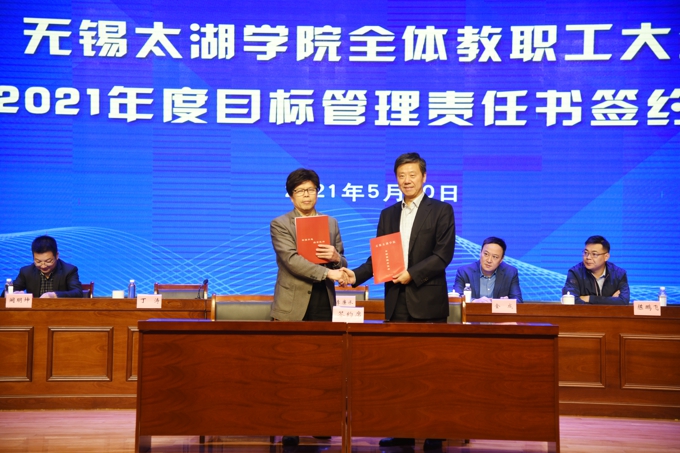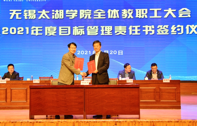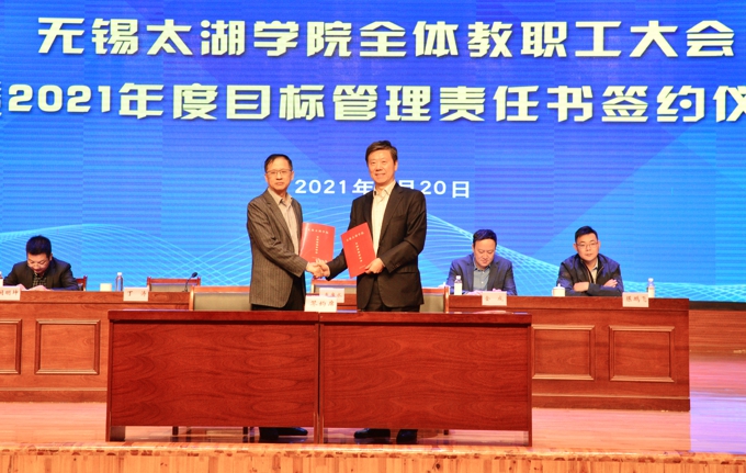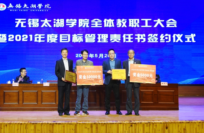 会上,副校长金成宣读了《关于表彰2020年度目标管理考核优秀集体的决定》,校领导为在2020年度目标管理考核中成绩优秀的集体颁发了表彰证书、发放了奖励,艺术学院、物联网工程学院等优秀二级学院,教务处、学工处、学校办公室、科技处、党委宣传部、保卫处等优秀职能部门负责人上台领奖。校长李廉水代表学校分别与物联网工程学院、智能装备工程学院、会计学院、智能建造学院、商学院、外国语学院、艺术学院、健康与护理学院等二级学院现场签订了2021年度目标管理责任书。