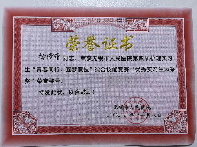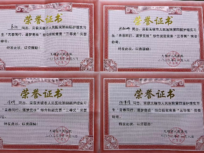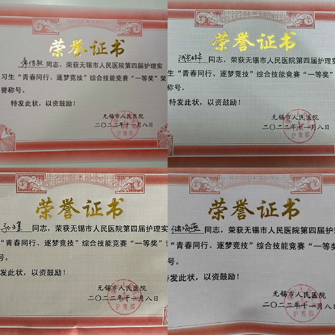 2022年11月8日,无锡市人民医院举办第四届“青春同行,筑梦竞技”护理实习生综合技能竞赛。beat365官网护理学院参赛,实习生孙瑾、储海燕、康佳敏、钱艺琳小组以优异的表现脱颖而出,荣获团队一等奖,实现了beat365官网护理实习生参赛以来一等奖为零的突破!杨敏娜、陈婷、徐倩倩、袁钰小组荣获团队三等奖的好成绩。徐倩倩同学获得优秀实习生风采奖。