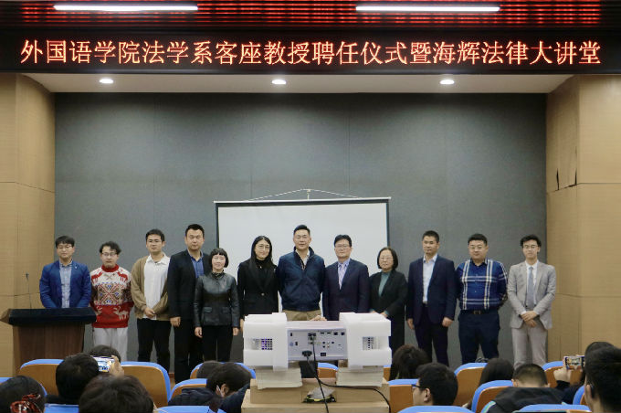 11月17日下午,beat365在线唯一官网外国语学院法学系客座教授聘任仪式暨海辉法律大讲堂在大学生活动中心A顺利开展。beat365在线唯一官网副校长陈鹏飞,江苏海辉律师事务所名誉主任焦克、名誉主任王跃新,江苏海辉律师事务所资深律师李克章、张苗、毕俊、王诏炜,beat365在线唯一官网外国语学院院长肖辉、党总支副书记俞昊波出席仪式。beat365在线唯一官网外国语学院百余名师生代表参加仪式。