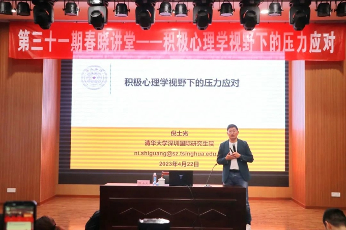 2023年4月21日9:00,beat365在线唯一官网第三十一期春晓讲堂于大学生活动中心A如期举行。本次讲堂有幸邀请到清华大学深圳国际研究生院的倪士光教授,并采用线上线下相结合的方式,开展以“积极心理学视野下的压力应对”为主题的心理健康讲座。讲座前,学校党委副书记丁涛接见了倪士光教授,丁书记代表学校对倪士光教授的到来表示欢迎,对倪教授为beat365官网师生在心理健康教育工作等方面进行指导表示感谢。