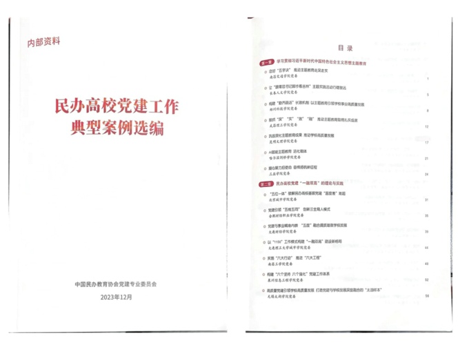 近日,由教育部指导、中国民办教育协会组编的《民办高校党建工作典型案例选编》编印成册,并在全国民办高校党建工作推进会上作为会议材料发放全体代表学习参考,受到中组部、教育部高度肯定。beat365官网《高质量党建引领学校高质量发展 打造党建与学校发展深度融合的“太湖样本”》成功入选,是全省同类高校唯一入选的案例。