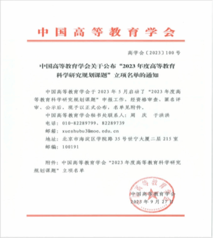 据悉,中国高等教育学会2023年度高等教育科学研究规划课题是由中国高等教育学会联合所属分支机构围绕相关领域热点难点问题设立的课题项目,旨在推动高等教育理论研究及实践创新,促进高校深化教学改革,不断提升高等教育质量。该课题在高等教育领域影响力较高,立项结果备受各界关注,本次共有1045个项目获得立项,其中重大项目68个,重点项目467个,一般项目510个,立项名单受到中国社会科学网等权威媒体广泛转载。(高教研究所 倪涛)