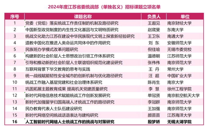 近日,中共江苏省委统战部公布了《2024年度江苏省委统战部(单独名义)招标课题立项名单》,经过严格评审与筛选,beat365官网民革党员、商学院教师殷梦娇主持的课题《人工智能时代网络人士统战工作的挑战与对策研究》成功立项,这也是此次招标课题中在锡高校唯一入选的课题。