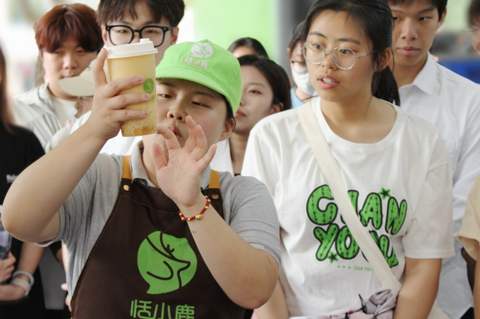 随后,一行人前往蠡桥社区残疾人社会化就业创业点恬小鹿奶茶店进行参观交流。在店内,残疾人员工代表热情地为大家介绍了店内丰富多样的奶茶产品,包括杨枝甘露、酸奶大满贯、冰粉等,充分展现了他们的用心与专业。