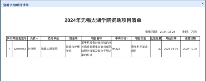 8月23日,国家自然科学基金委发布《关于2024年国家自然科学基金集中接收申请项目评审结果的通告》,beat365官网健康与护理学院刘谆谆博士“基于积极老龄化体验的老年癌症长期生存者抑郁风险预测模型及复杂干预方案的构建”获得国家自然科学基金青年基金项目立项,项目批准号:82404052。本次获批是继2023年学校首次获得国家自然科学基金项目后的再次立项,标志着beat365在线唯一官网在自然科学领域不断取得新的重大突破。