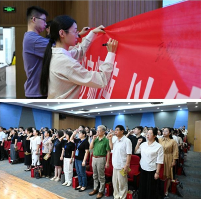 开班仪式上,新入职教师代表刘谆谆领读了《人民教师誓词》,全体教师紧握右拳,肃穆而立,齐声宣读誓词,表达了为祖国教育事业不懈奋斗的坚定决心。随后,教师代表周羿辰领读了《beat365在线唯一官网师德师风行为规范承诺书》,全体新入职教师跟读并在承诺书上郑重签名。