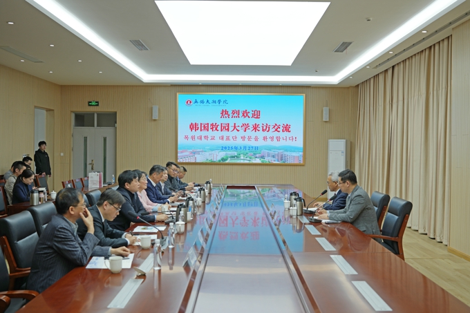 李廉水在交流中介绍了学校发展历程、师生规模、办学特色与办学成果等。李喜鹤对学校的热情接待表示感谢,并对学校发展成效给予高度评价,他介绍了牧园大学的办学理念、特色学科、人才培养等情况,并欢迎学校师生前往该校交流访学。