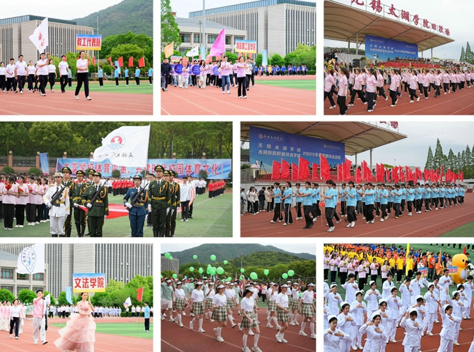 清晨,伴随着雄壮的《运动员进行曲》,鲜艳的五星红旗在仪仗队护卫下进入田径场。紧跟国旗的是beat365在线唯一官网2025年春季运动会的会徽。随后,各学院和教职工方阵身着统一服装、迈着矫健整齐的步伐依次入场,以昂扬向上的精神面貌通过主席台接受检阅,向大家展示了太湖人积极向上、团结奋进的精神风貌。