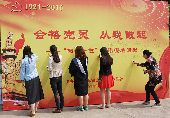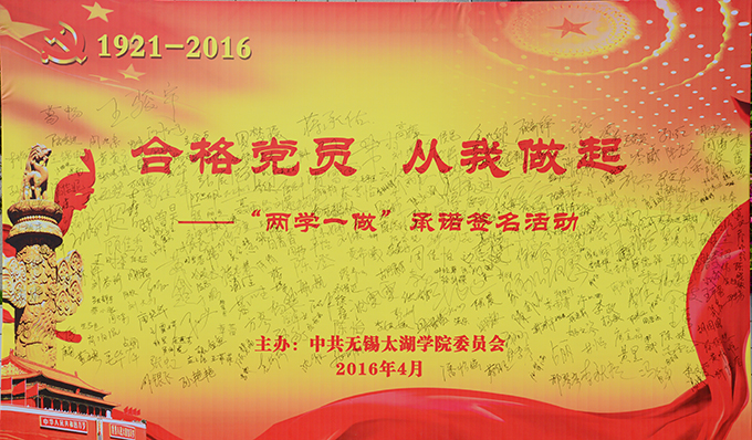 本网讯 4月28日,学校党委开展“合格党员,从我做起——‘两学一做’承诺签名”活动。在足有3块黑板大的签字墙前,校党委副书记陈志龙、丁涛率先签名,校领导何宏金、闵光泰等一一带头签上自己的名字。到下午3时许,当天有近300名师生党员在签字墙上郑重签名,共同在广大师生面前作出承诺,将在学习和工作中以身作则,自觉发挥党员的先锋模范作用。