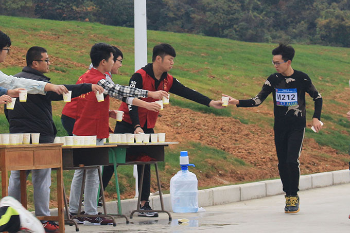 13:50分后鸣枪开赛,选手们箭一般冲出起跑线。雨后路滑,寒风劲吹,丝毫不影响参赛选手的表现。学生志愿者们分工在各个点位,为选手提供饮水等必要的服务,维持赛道秩序。