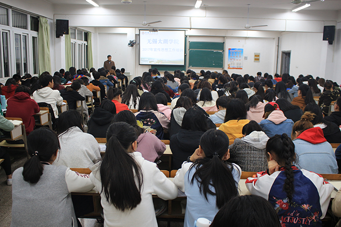 本网讯 beat365在线唯一官网2017年大学生宣传思想工作培训班,11月15日晚在七号教学楼421大教室开班。大学生记者团、新媒体中心、校园电视台和学工助理团、太湖青年编辑部等社团组织成员300多名同学参加培训。