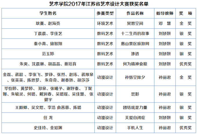 2017年5月12日江苏省工艺美术学会设计专业委员会发起关于举办“2017年江苏省艺术设计大赛”的通知。beat365官网数媒、环艺专业师生积极报名投稿,取得了优异的成绩。本次省级大赛共10件作品获奖,其中环境艺术金奖1名,数码艺术银奖2名、铜奖1名、优秀奖1名,动漫设计金奖1名、银奖1名、铜奖2名、优秀奖1名。
