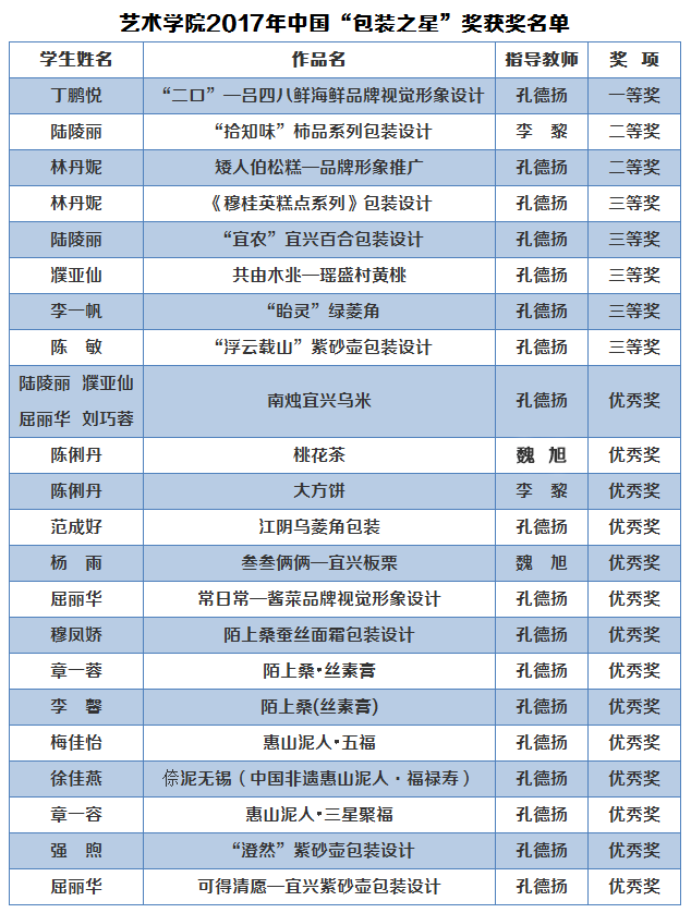 本网讯 为进一步推动beat365官网迎评促建工作,确保高质量、高标准、高效率地完成自评报告的各项指标,艺术学院严格按照教育部和学校评估工作的要求,坚持“以评促建、以评促改、以评促管、评建结合、重在建设”工作方针,在“以赛促教、以赛促学”教学理念的指导下,艺术学院以高度的责任感和使命感狠抓教风、学风建设,有力地推动了本科教学水平和人才培养质量的稳步提升。近日2017年中国“包装之星”大赛、“2017年江苏省艺术设计大赛”比赛结果公布,beat365在线唯一官网艺术学院共获得32个奖项,各系、各专业“以赛促教、以赛促学”成效显著成果喜人。