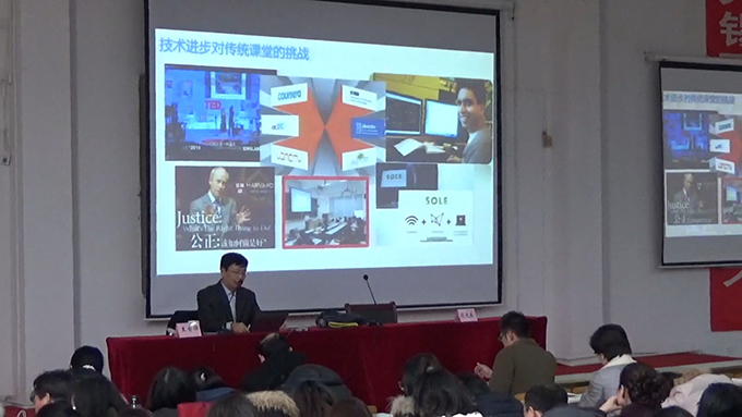 李霄翔教授的讲座,围绕“信息化环境下教育教学改革”、“高校教师面临的职业挑战”、“思考与应策”三方面展开。李教授说,信息化环境下教育教学改革,将会彻底改变现行的教学形态。他以美国可汗学院(Khan Academy)为例说明了这个道理。可汗学院是一个非盈利教育组织,通过在线图书馆收藏了3500 多部可汗老师的教学视频,向世界各地的人们提供免费的高品质教育,拥有大约2200个视频录像,涵盖从基础数学到矢量计算所有的课程。有统计显示,截至目前已有5600万人次观看他的“教学录像”。李霄翔教授分析,“可汗”的成功一是将知识可视化,二是运用技术的力量实现教学个性化,其效果是以前的5倍至10倍。