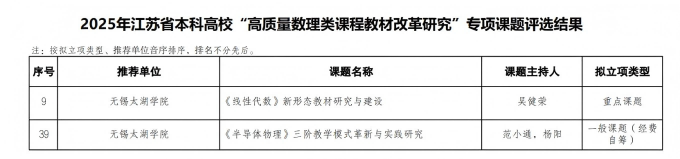 近日,江苏省高等教育学会公布2025年江苏省本科高校“高质量数理类课程教材改革研究”专项课题评选结果,beat365官网申报的2项课题全部获批立项,其中吴健荣教授主持的“《线性代数》新形态教材研究与建设”入选重点课题,范小通博士主持的“《半导体物理》三阶教学模式革新与实践研究”获批一般课题。彰显学校了在数理类课程教材改革领域的扎实研究基础与创新实践能力。