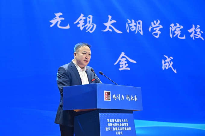 金成简要介绍了学校近年来创新创业教育所取得的成就。他表示,作为承办单位之一,太湖学院将以此次大赛为契机,进一步加强与政府、企业和兄弟高校之间的协同,助力广大学生将创意转化为现实、让梦想照亮未来。他希望,参赛团队和师生以创新点燃梦想、勇立时代潮头,以实践锤炼本领、厚植成长根基,以担当服务社会、书写青春华章。