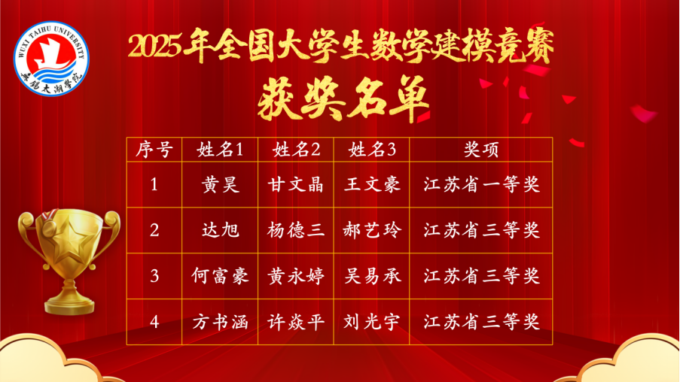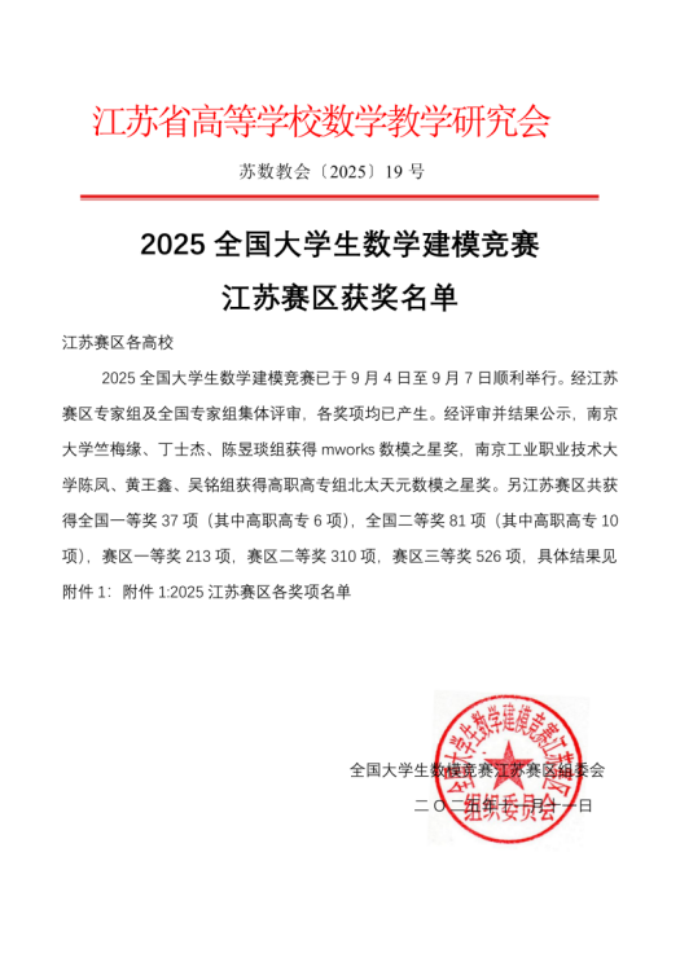 近日,2025全国大学生数学建模竞赛江苏赛区获奖名单正式公布。beat365官网首次参加该赛事,共有10支队伍参赛,在强手如云的本科建模赛道脱颖而出,凭借扎实的学科功底与出色的实践能力斩获省级一等奖 1 项、省级三等奖 3 项,参赛队伍获奖比例达40%,在这项权威赛事中实现开门红,位居江苏省同类高校前列。