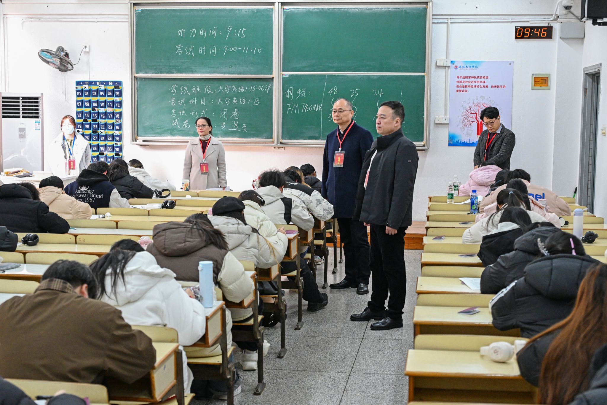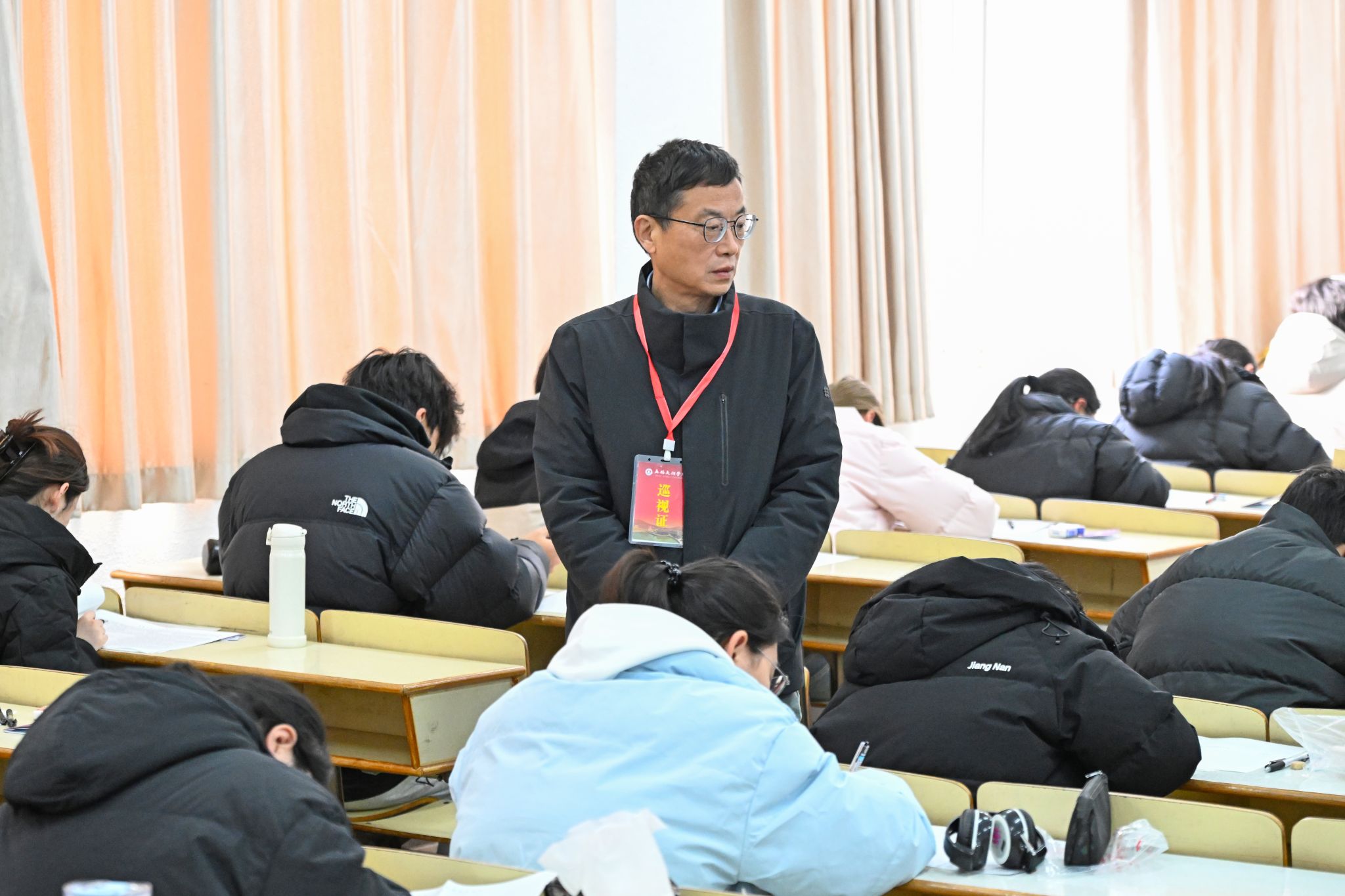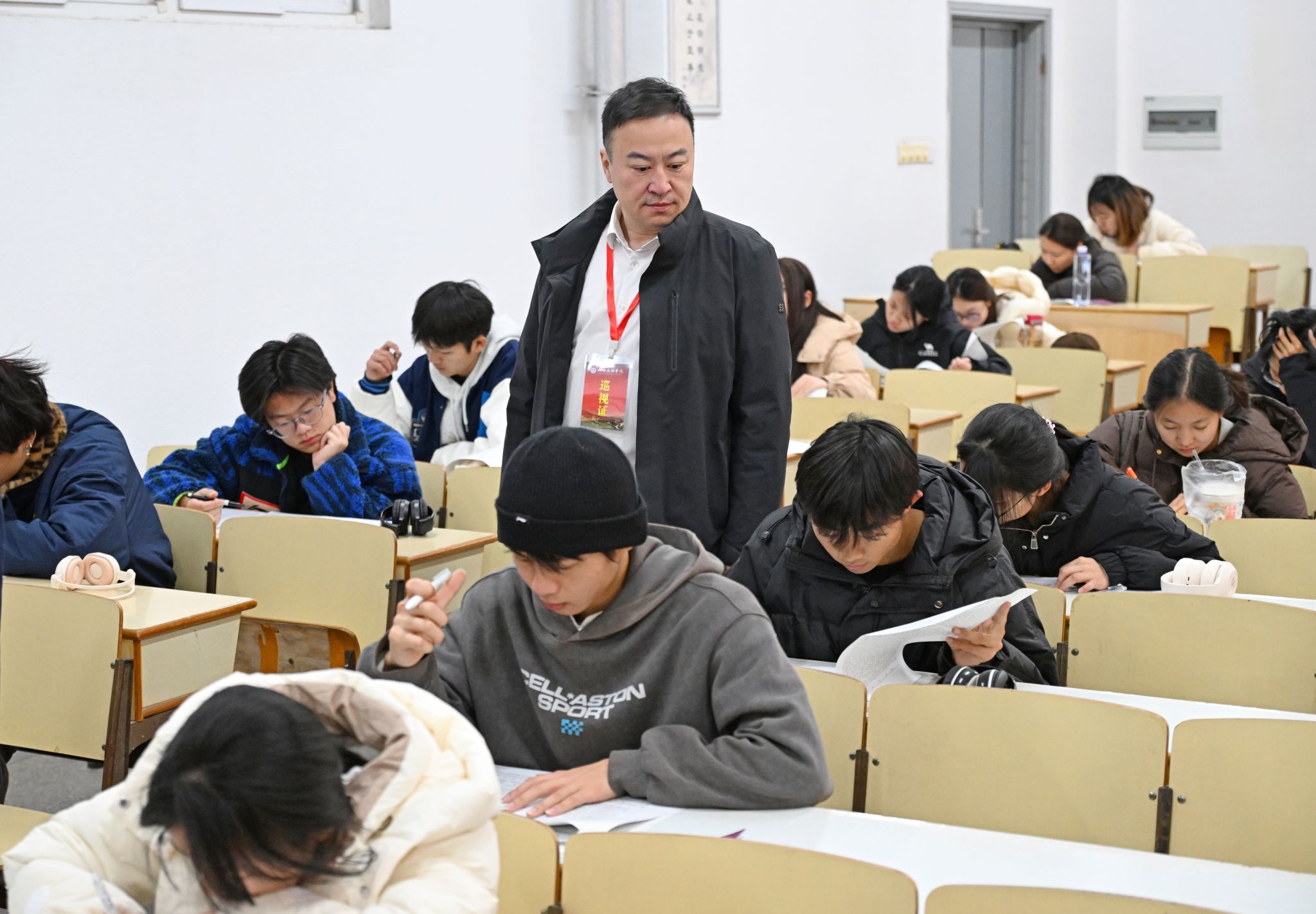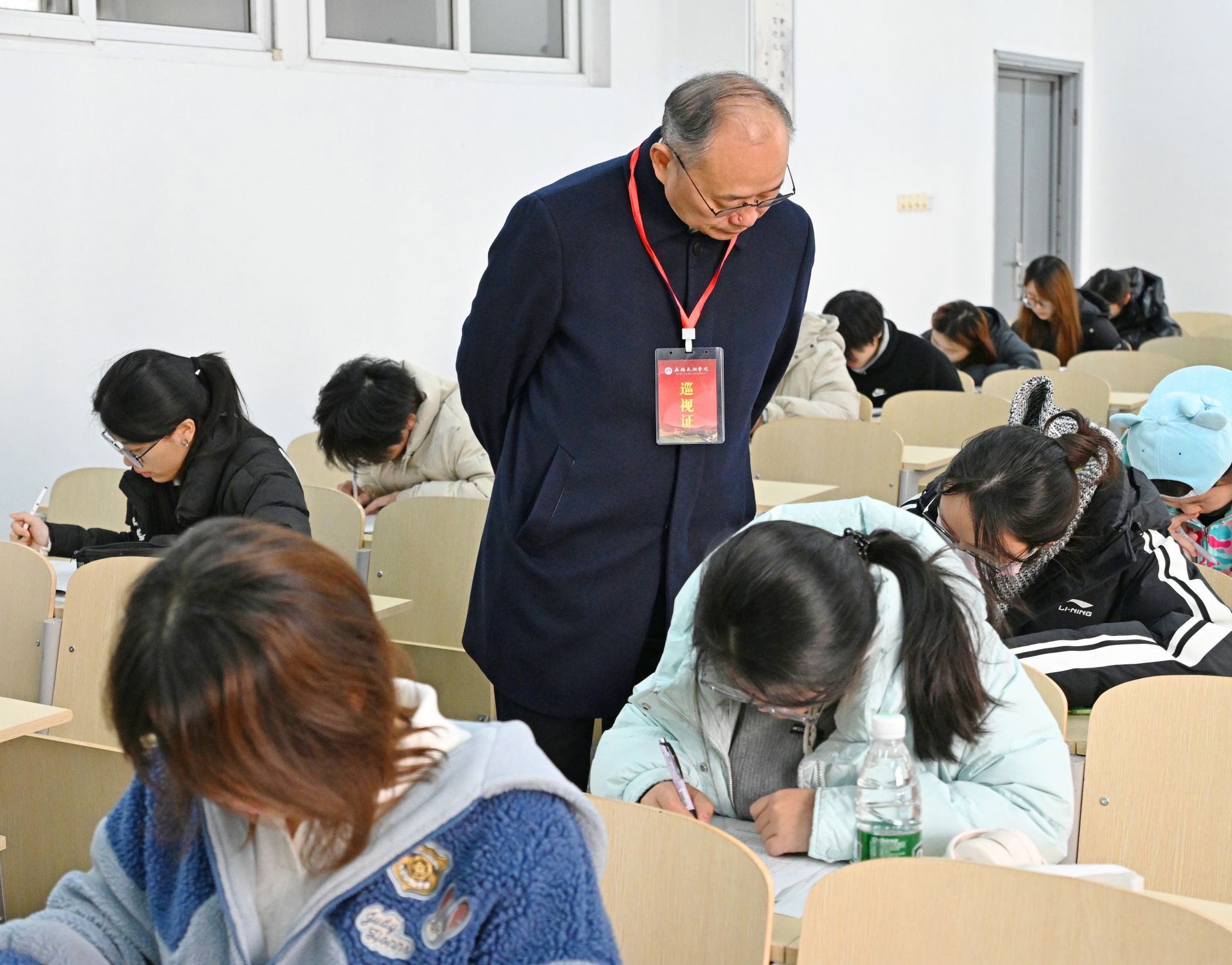 1月12日上午,校长金成、执行校长方忠、副校长吴健荣带队,与教务处、组织人事处、党委学工部、党委宣传部及二级学院相关负责人,深入大一新生期末考试现场开展巡考工作。据悉,1月12日至14日,学校2025级新生期末考试全面展开,共安排497场次,涉及考生20380人次,安排监考教师1078人次。校领导一行通过实地巡查与视频监控同步巡查相结合的方式,对考务组织、考场秩序、硬件保障等关键环节进行了全覆盖巡查。