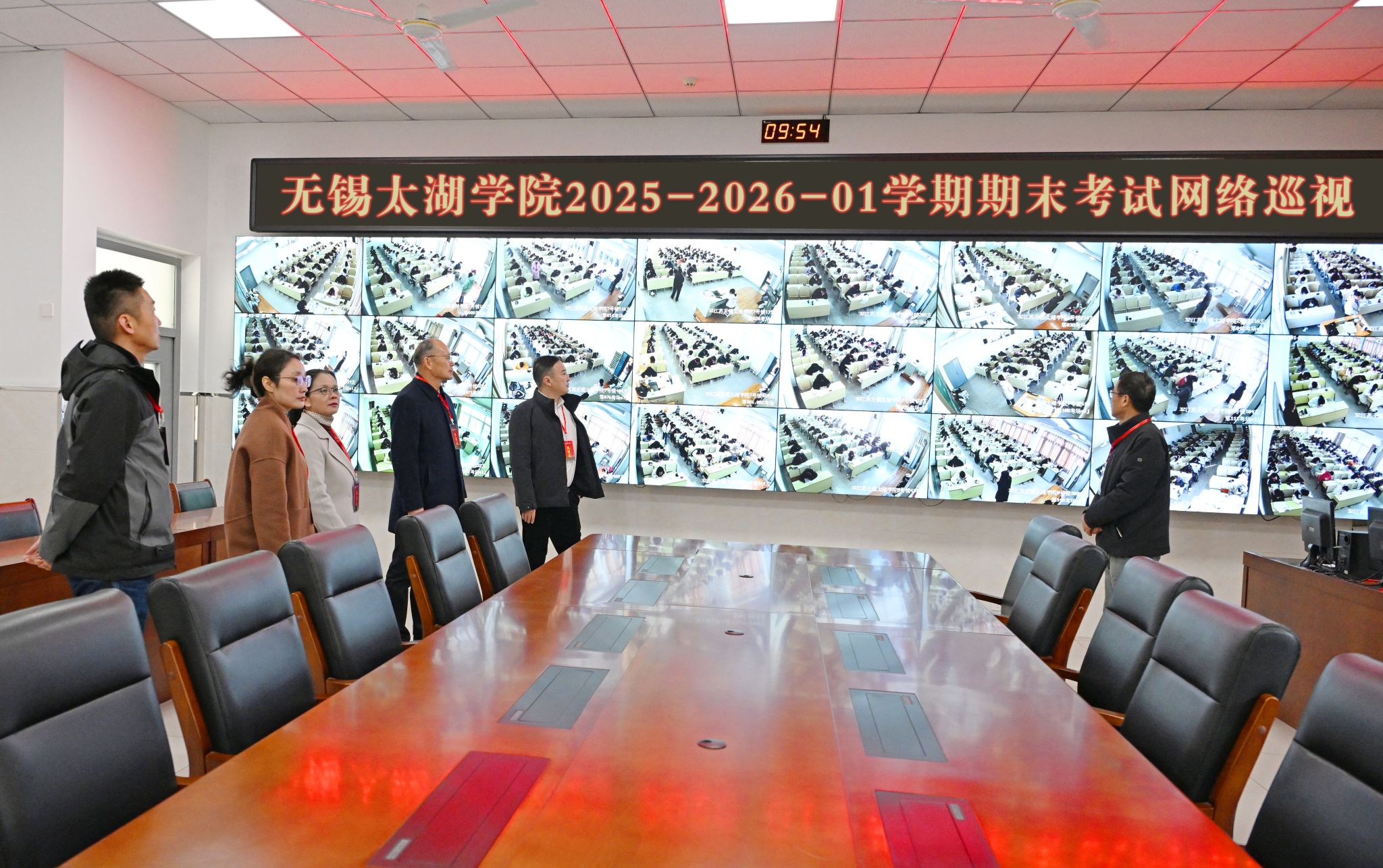 考前,相关部门对考场硬件设施等进行了全面检查,切实保障网络稳定、电力供应和监控设备正常运行,营造了安全、公正、舒适的考试环境。从巡考情况看,各考场秩序井然,监考教师准时到岗、履职严谨,考生自觉遵守纪律、沉着应考,考场环境整洁规范,考试物资保障充足,充分展现了学校严谨高效的考务管理水平和学生诚信应考的优良风貌。在视频监控室,校领导通过实时画面全面巡查各考场动态,重点检查监考履职、考生状态及应急响应机制运行情况。校领导对本次考试的组织工作给予充分肯定,指出考风考纪是校风学风建设的“试金石”,必须坚持以高标准、严要求抓实抓细各个环节,通过规范考务流程、强化巡考督查,筑牢考试公平的坚实防线。