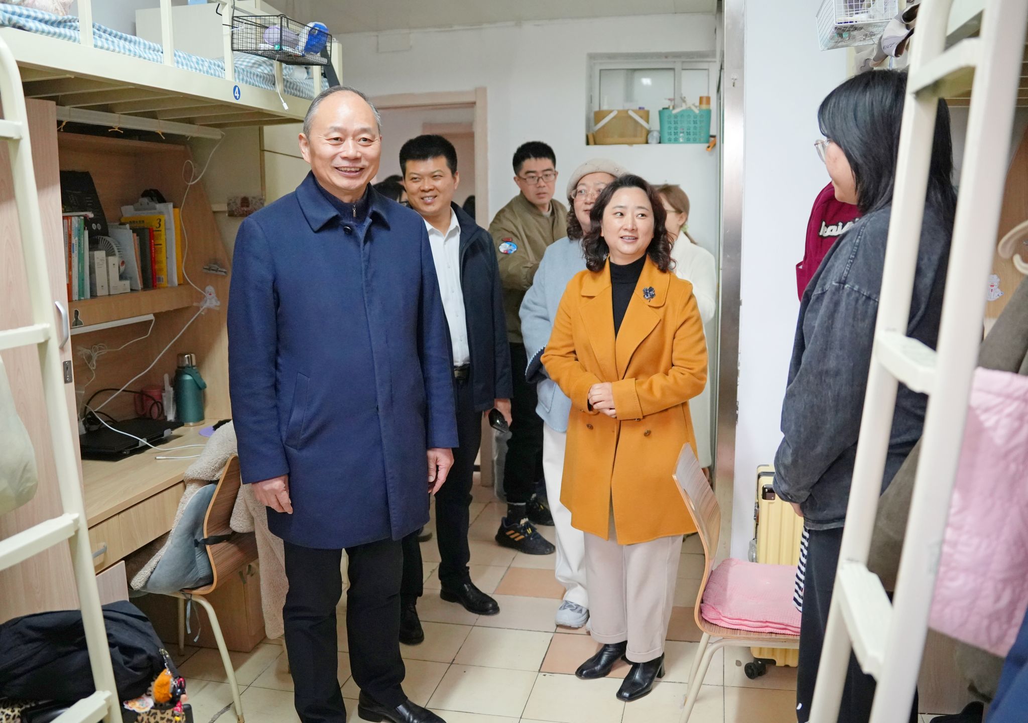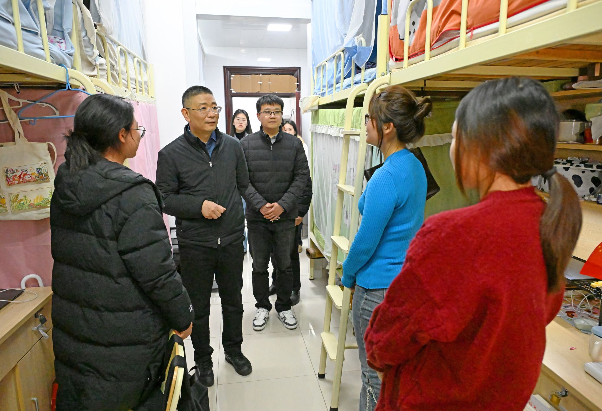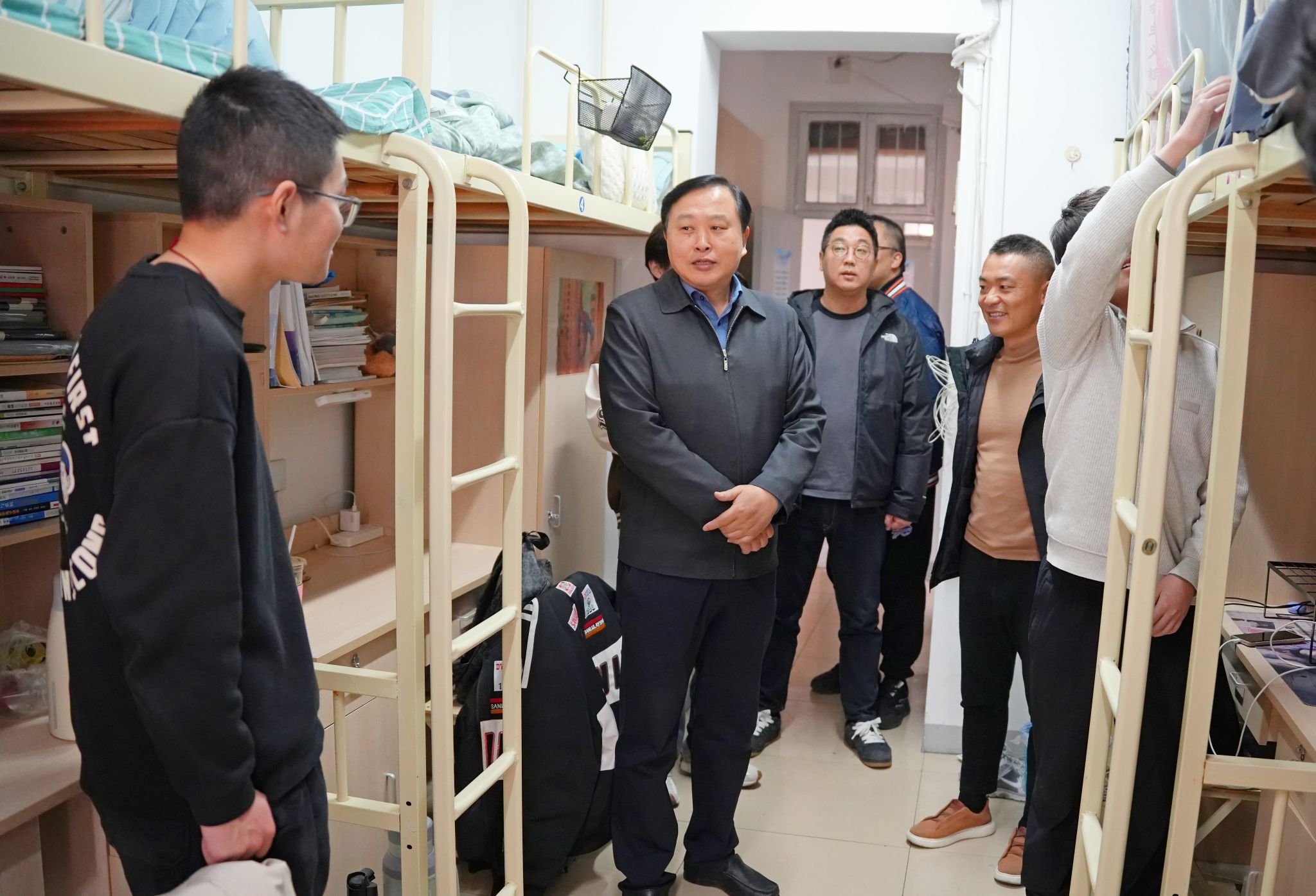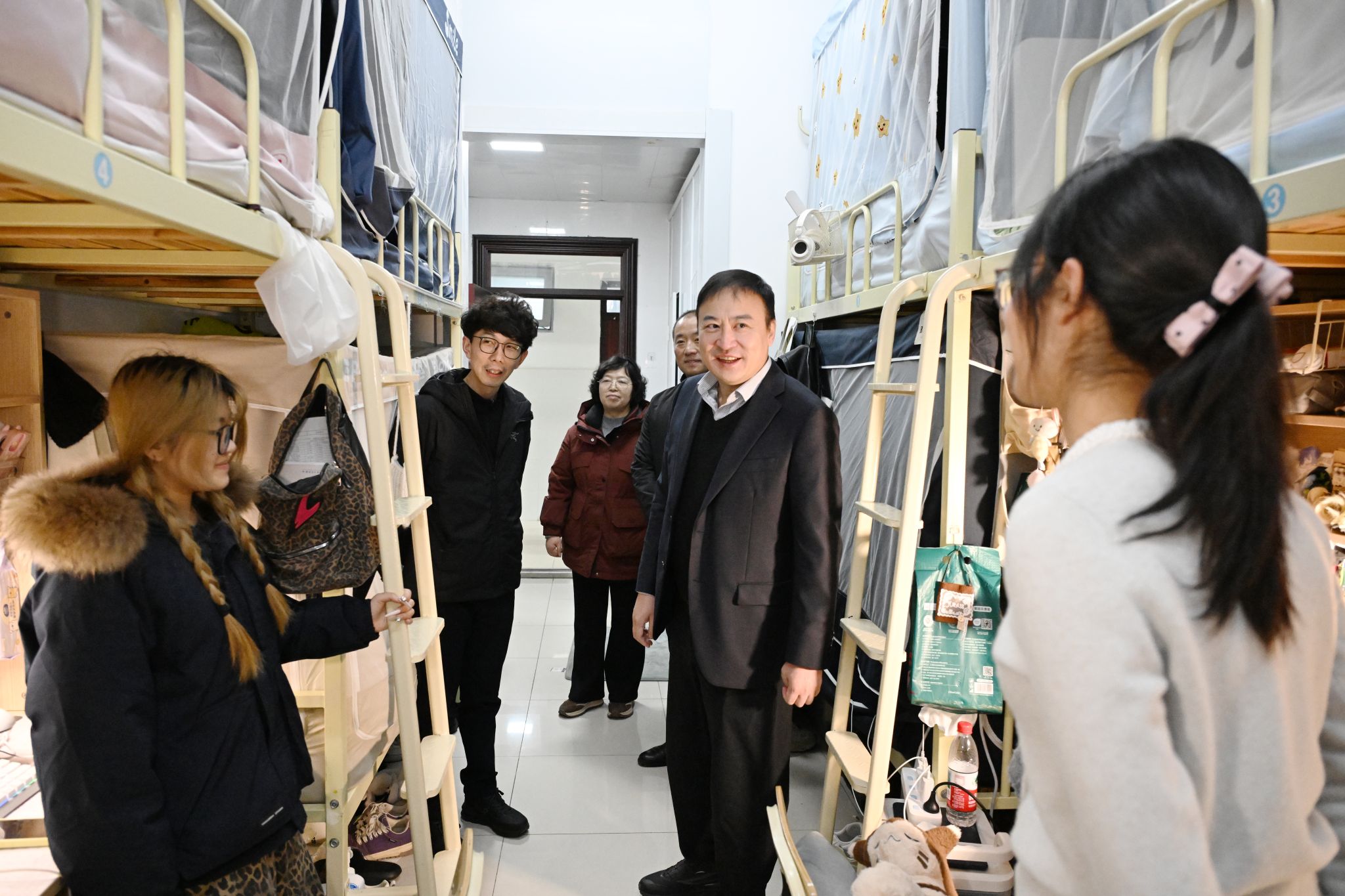 校领导们详细询问了同学们新学期的学习计划、课程进度以及在校生活情况,重点了解了大家在学业发展、职业规划、生活保障等方面遇到的困惑与需求。走访中,校领导强调,同学们要珍惜大学时光,夯实专业基础,积极投身实践,将个人成长与国家发展、社会需要紧密结合;要注重培养健康的生活习惯和积极向上的精神风貌,营造和谐友善的宿舍氛围;遇到任何困难和问题,要及时通过辅导员、学院或一站式学生社区等渠道向学校反映,学校始终是同学们最坚实的后盾。