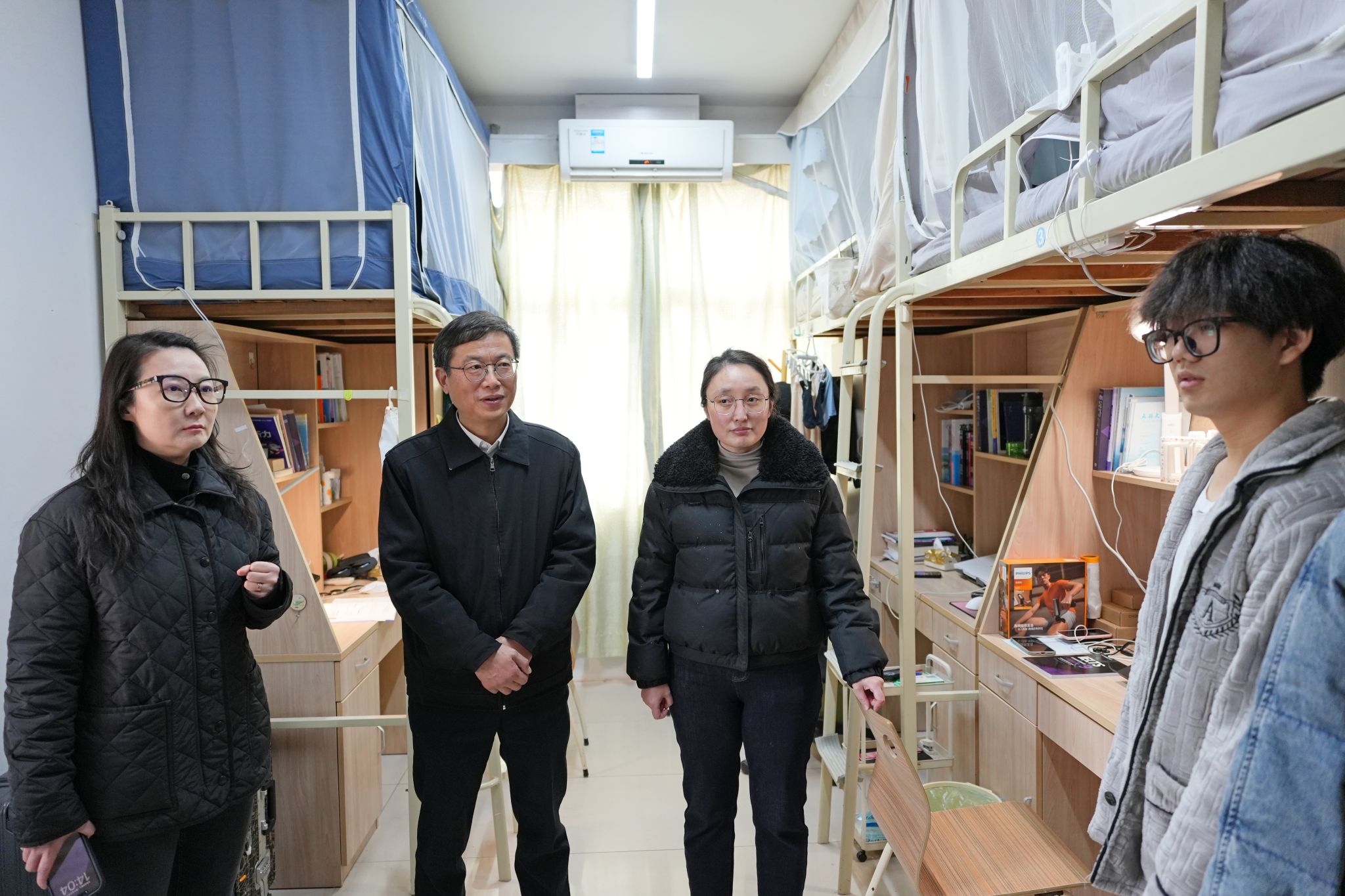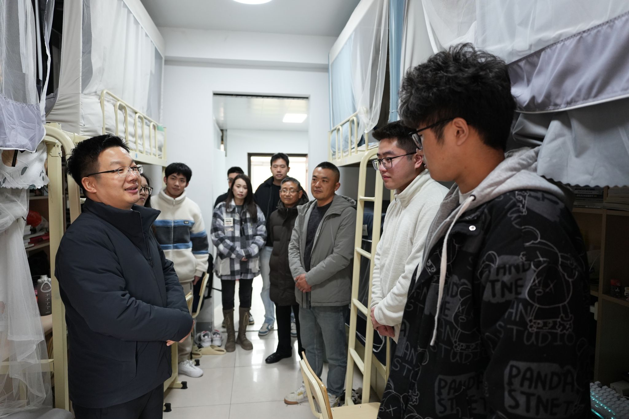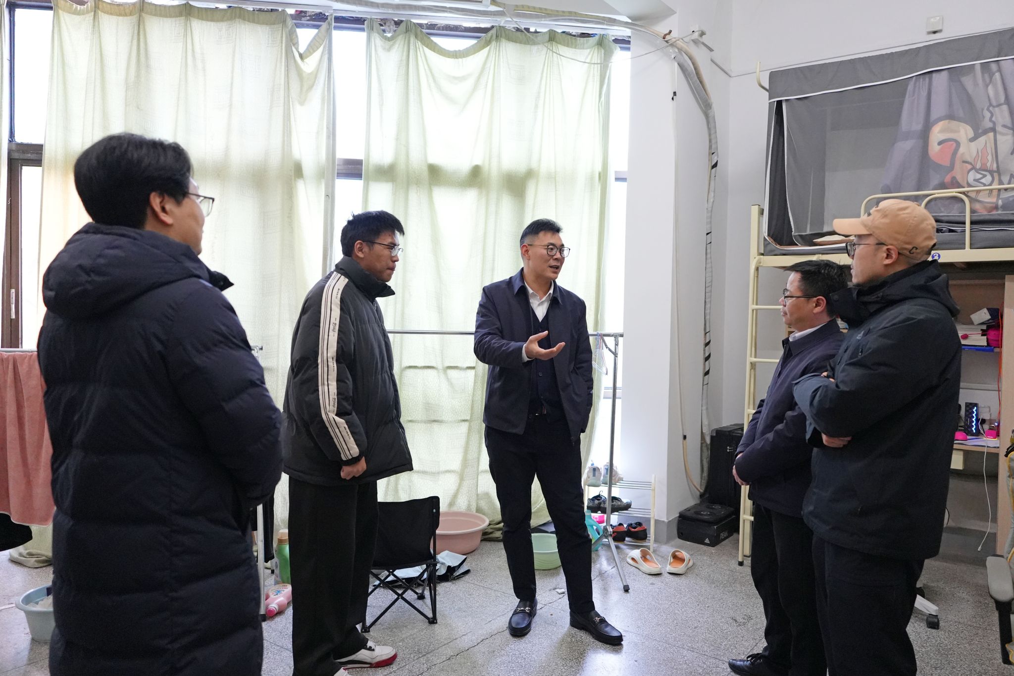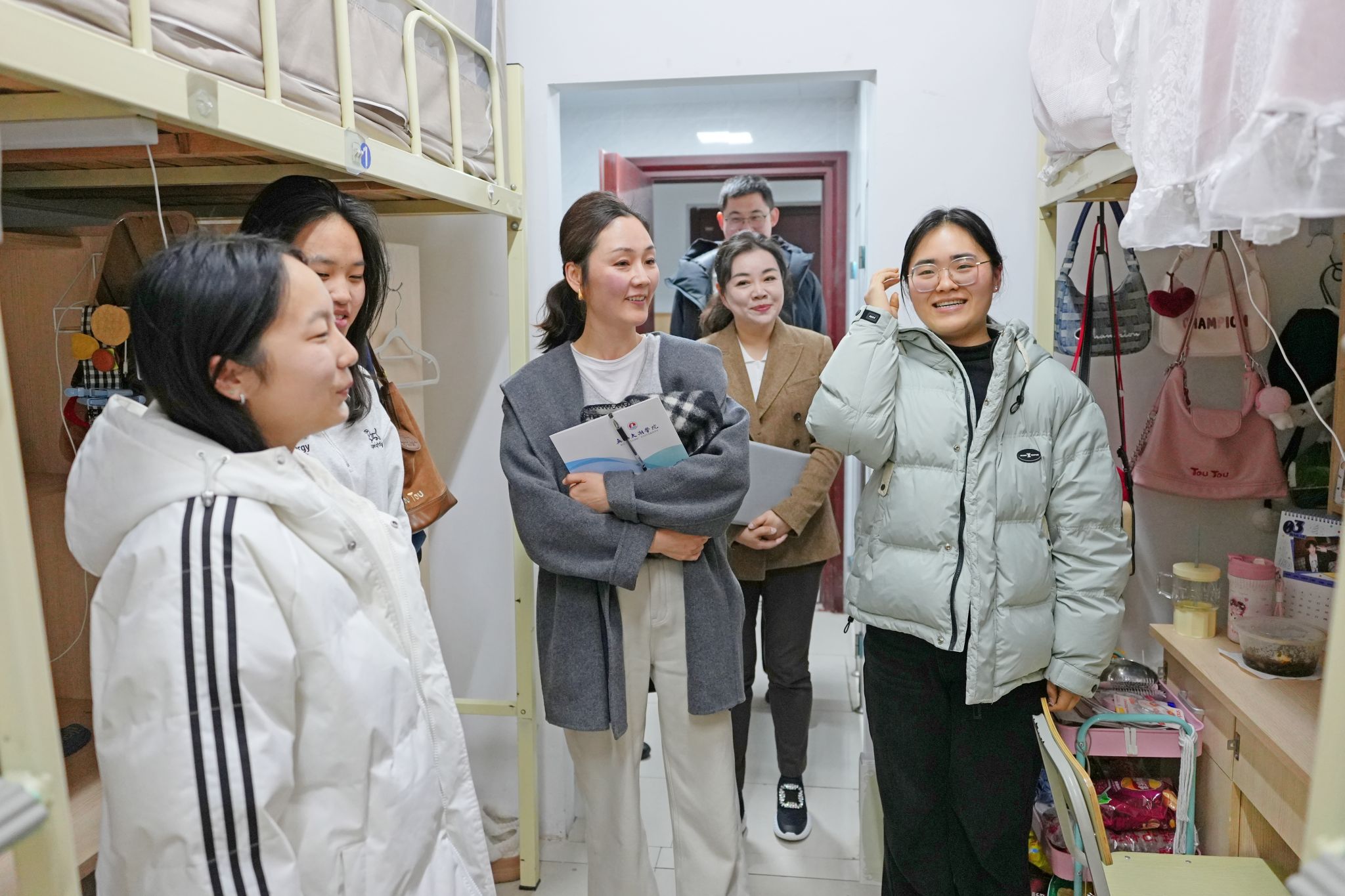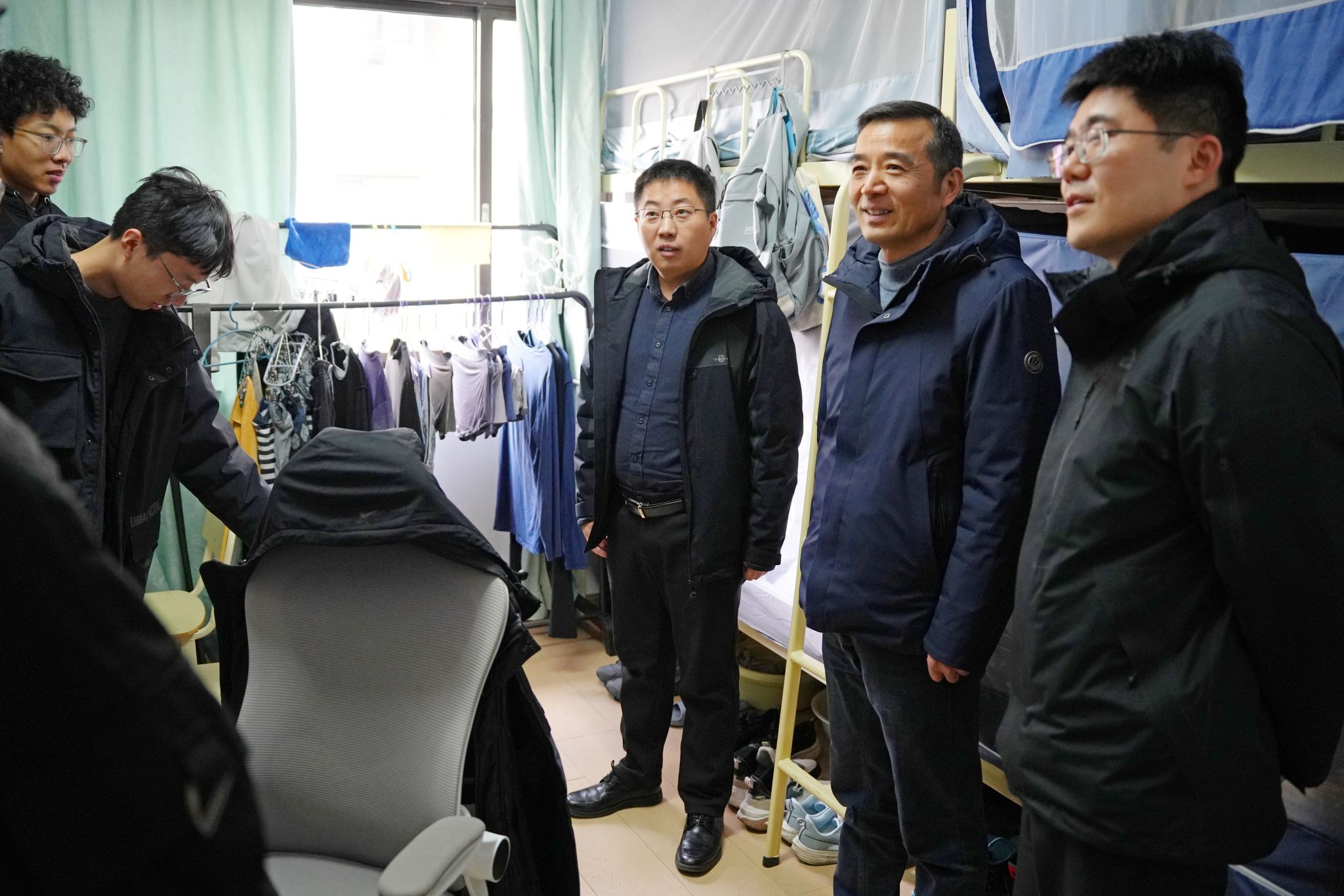 校领导们详细询问了同学们新学期的学习计划、课程进度以及在校生活情况,重点了解了大家在学业发展、职业规划、生活保障等方面遇到的困惑与需求。走访中,校领导强调,同学们要珍惜大学时光,夯实专业基础,积极投身实践,将个人成长与国家发展、社会需要紧密结合;要注重培养健康的生活习惯和积极向上的精神风貌,营造和谐友善的宿舍氛围;遇到任何困难和问题,要及时通过辅导员、学院或一站式学生社区等渠道向学校反映,学校始终是同学们最坚实的后盾。