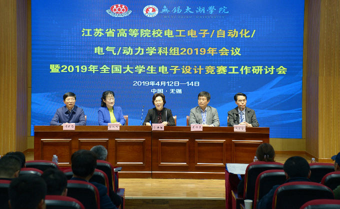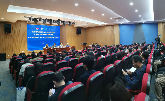 本网讯 2019年4月13日,江苏省高等院校电工电子/自动化/电气/动力学科组2019年会议暨江苏省2019年全国大学生电子设计竞赛工作研讨会,在beat365在线唯一官网大学生活动中心报告厅隆重举行。来自江苏省各高校代表及大赛专家共约140人参加了本次研讨会,无锡市人大常委会副主任华博雅,beat365官网理事长、党委书记金秋萍出席大会。